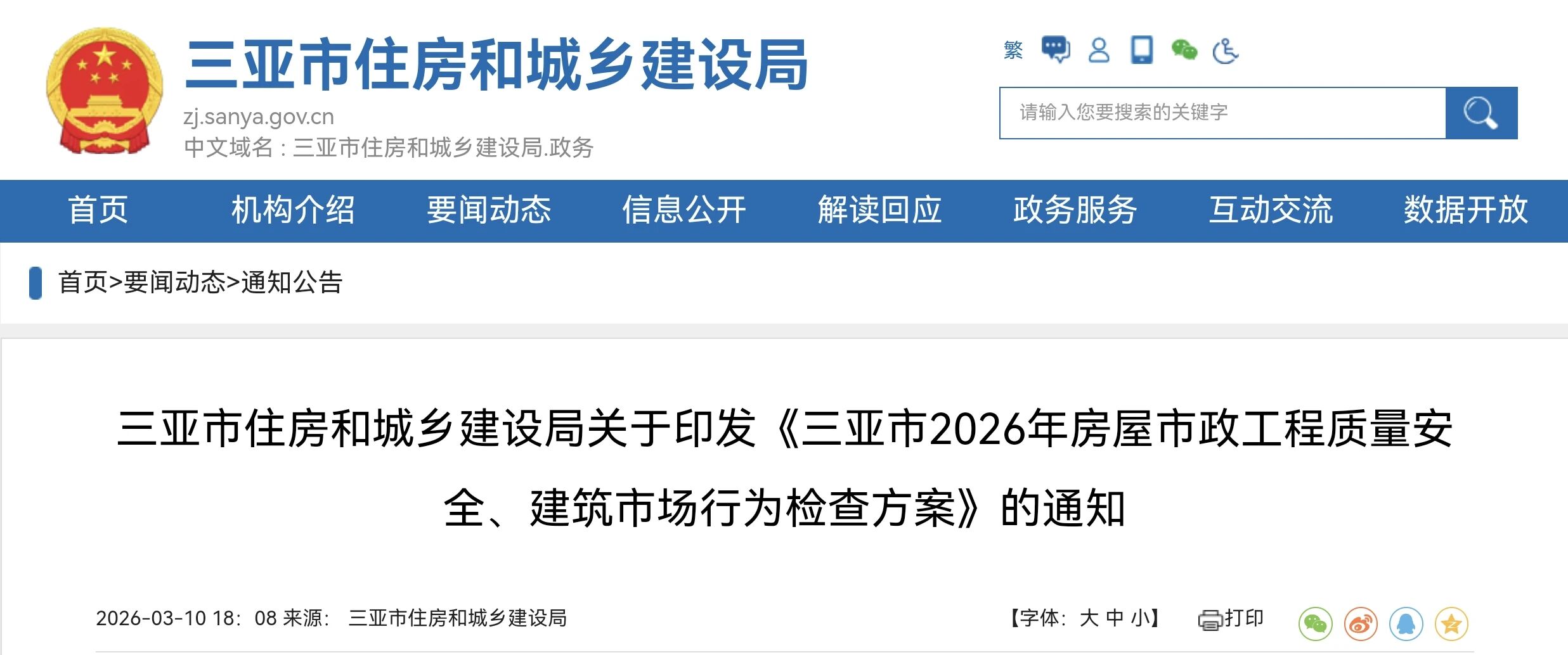 三亚市住房和城乡建设局:关于印发《三亚市2026年房屋市政工程质量安全、建筑市场行为检查方案》的通知